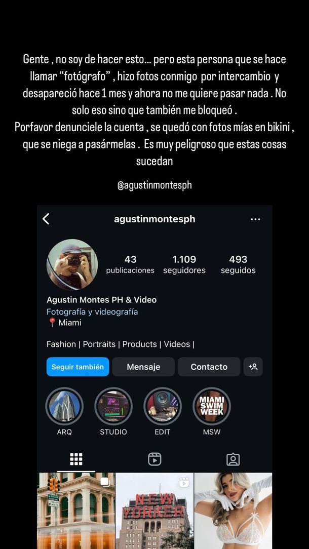 “Se quedó con fotos mías en bikini, que se niega a pasármelas. Es muy peligroso que estas cosas sucedan”, agregó arrobando y subiendo una captura del perfil del fotógrafo en cuestión.