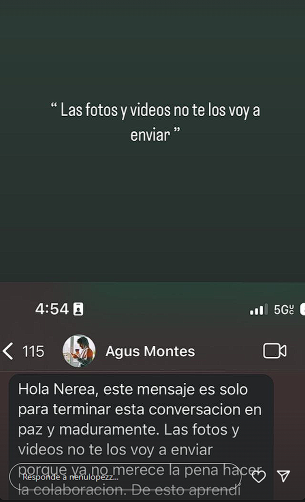 Nenu López detalló sobre la continuidad de la situación: “Estuve tres semanas enviándole mensajes y no obtuve respuestas: hasta que me cansé y le dije que si no me respondía me iba a encargar de que la gente en Instagram se enterara, porque son mis fotos y se las estaba quedando él. A lo que hoy me contestó que las fotos no me las va a enviar y que haga lo que tenga ganas, pero que no me las va a enviar. Yo lo único que quiero son mis fotos, porque yo mi parte del trabajo ya la hice. Él no puede decidir porque él quiere, que yo no las tenga”.