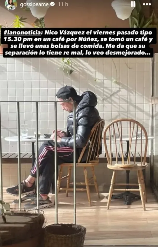 Una de las primeras imágenes de Nico en su nuevo entorno llegó de la cuenta Gossipeame. En la fotografía se lo observa sentado en la mesa de un café de la zona, solo, con el gesto serio y enfocado en sus asuntos, mientras disfruta de una tarde soleada. “Nico Vázquez el viernes pasado tipo 15.30 en un café por Núñez. Se tomó un café y se llevó unas bolsas de comida”, escribió la panelista y agregó, evaluando su estado: “Me da que su separación lo tiene remal, lo veo desmejorado”.