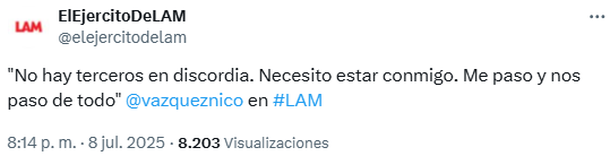 Luego de informar su ruptura con Gime Accardi, el actor Nicolás Vázquez salió a hablar en LAM, a través de una comunicación telefónica con Ángel de Brito: "Si nosotros estamos en shock, imagino que a ustedes y al público que nos quiere les debe pasar lo mismo, pero hoy no puedo pensar en eso, sino pensar en nosotros, que es lo más importante".