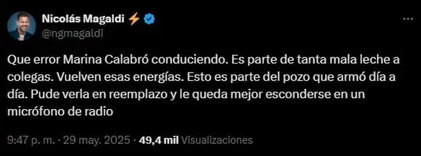 “Qué error Marina Calabró conduciendo. Es parte de tanta mala leche a colegas. Vuelven esas energías. Esto es parte del pozo que armó día a día”, lanzó Magaldi en sus redes, generando una ola de reacciones. La crítica fue directa y sin anestesia, especialmente considerando que Calabró se encuentra reemplazando temporalmente a Mariana Fabbiani en DDM por América TV, quien está de vacaciones en Nueva York.