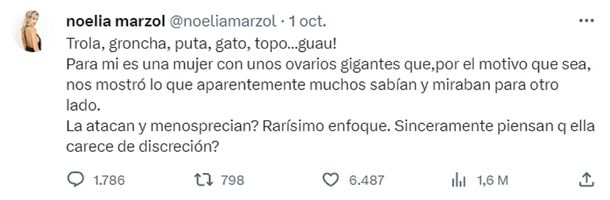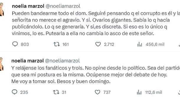 A otra de las respuestas, Noelia Marzol contestó reafirmando su postura: “Pueden bardearme todo el domingo. Seguiré pensando que el corrupto es él y la señorita no merece el agravio. Y sí. Ovarios gigantes. Sabía lo que hacía publicándolo, lo que se generaría. Y sí, es discreta. Si eso es lo único que vinimos, lo es. Putearla a ella no cambia el asco de este señor”.