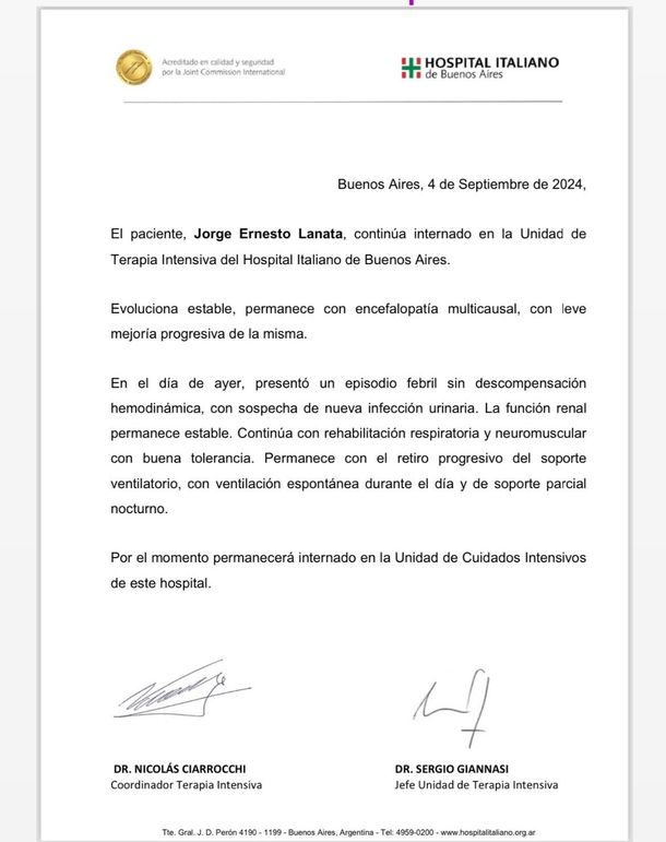 Este miércoles 4 de septiembre el centro de salud emitió un nuevo parte médico firmado por el Dr. Nicolás Ciarrocchi, coordinador de Terapia Intensiva, y el Dr. Sergio Giannasi, el jefe de esa misma área. El mismo especifica que "el paciente Jorge Ernesto Lanata continúa internado en la Unidad de Terapia Intensiva del Hospital Italiano de Buenos Aires".