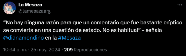 Tras esto, la canciller sostuvo que la reacción del Gobierno español "ha sido exorbitante", aunque reconoció que "puede haber habido algún error" de Milei. Casi como desentendiéndose de la situación, Mondino indicó que "de nuestro lado no hay ningún inconveniente" y sostuvo que "tenemos una confusión notable entre una persona y un Estado", insistiendo en que el problema del primer mandatario argentino es estrictamente con Sánchez y no con el país ibérico.