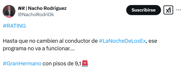 La Noche de los Ex, que conduce Robertito Funes Ugarte, no funciona, no logra captar audiencia, más allá de que siempre Gran Hermano, con buenos o malos números, es el programa más visto en la televisión argentina.