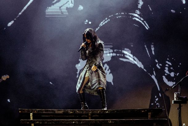Pero su imagen también habló en el festival cordobés. El vestuario, que combinó dureza y estética pop, fue una crónica textil de la disputa entre la artista y el Gobierno.