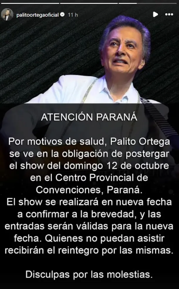Respecto a los compromisos cancelados, desde la cuenta oficial del artista informaron que el primero de los shows suspendidos fue el programado para el 9 de noviembre en el Centro Provincial de Convenciones de Paraná, decisión tomada “por causas de fuerza mayor”. Las entradas podrán devolverse por el mismo medio de compra.
