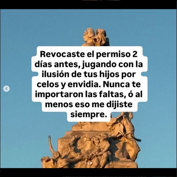 "Me callé mucho tiempo por mis hijos, por querer sostenerles un mundo de fantasía, no más. El papá del año, que mágicamente quiere pasar más tiempo con sus hijos justo ahora que hay un hombre en mi vida al cual AMAN y ADMIRAN. El papá del año que me firmó la tenencia cuando me separé porque estaba muy ocupado. Revocaste el permiso 2 días antes, jugando con la ilusión de tus hijos por celos y envidia. Nunca te importaron las faltas, ó al menos eso me dijiste siempre", concluyó.