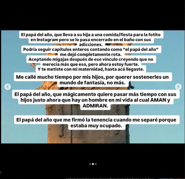Y continuó: "El padre que pide que le saquen fotos las dos veces que va a buscarlos al colegio porque hay 'una imagen que sostener'. El que me era infiel con una mujer mientras yo llevaba a su hijo en la panza. Quién se encargó de destruir poco a poco mi autoestima en momentos difíciles. El papá del año, que cuando le decía llorando que me quería separar me respondía: 'separáte, quien te va a querer con 3 hijos?'. El hombre que me enseñó que los celos profesionales en la pareja existían, haciéndome sentir mal cada vez que algo me salía bien".