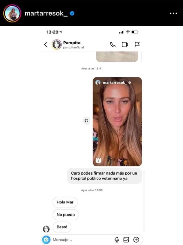 Tras la publicación por parte de Tarrés de la conversación que mantuvieron ambas en relación a la junta de firmas para un hospital veterinario público, la influencer se descargó duramente contra la esposa de Roberto García Moritán por no querer apoyarla en ese momento, a pesar de que Pampita fue contundente y agradable a la vez.