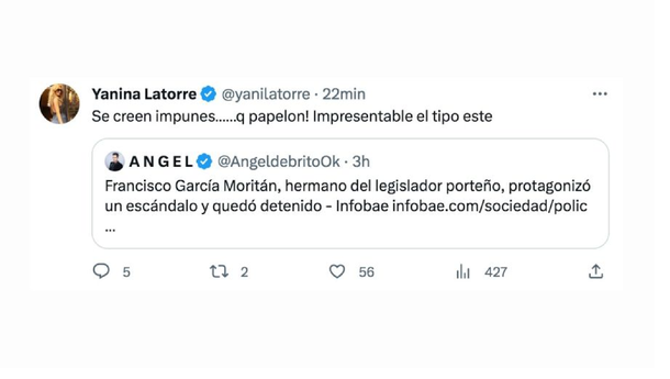 Francisco García Moritán, el hermano de Roberto García Moritán, fue detenido durante la madrugada por manejar alcoholizado por Pueyrredón y Libertador, a lo que Yanina Latorre con su lengua filosa lo defenestró en la red "X" (ex Twitter).