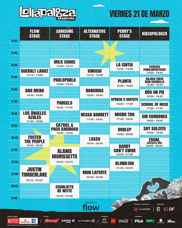 En cuanto a los headliners, sus presentaciones fueron organizadas de manera consecutiva para evitar solapamientos. Así, el viernes 21 de marzo, Alanis Morissette abrirá la tanda de shows principales, seguida por Justin Timberlake. El sábado 22, Sepultura subirá primero al escenario antes de dar paso a Tool, mientras que el domingo 23, Tan Biónica calentará el ambiente previo al cierre de Olivia Rodrigo en el Flow Stage.