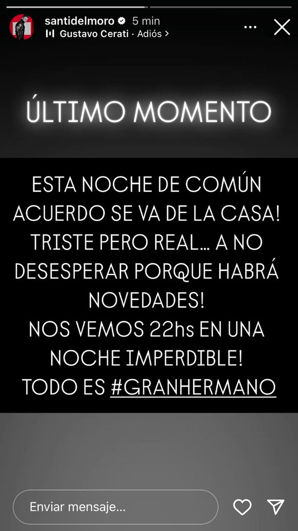 "Último momento. Esta noche de común acuerdo se va de la casa. Triste pero real... ¡A no desesperar porque habrá novedades! ¡Nos vemos 22hs en una noche imperdible! Todo es #GranHermano", así reveló el conductor que uno de los participantes del reality abandonará la casa mediante la puerta giratoria.