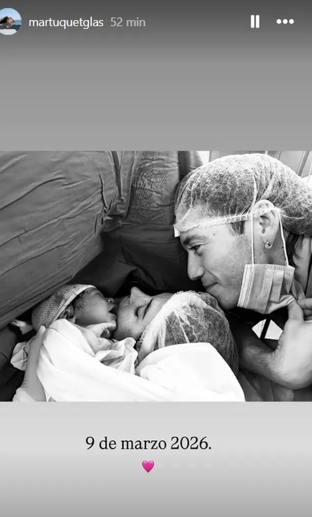 "9 de marzo 2026", expresó la joven al acompañar la foto del momento del parto, en el que los tres aparecen abrazados y visiblemente emocionados. Por su parte, el músico también utilizó sus historias para dedicarle unas palabras a su pareja.