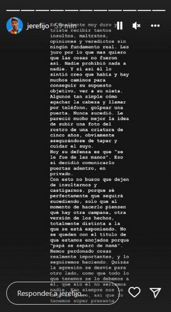 Jeremías sostuvo que, tras el posteo de Piñón, él y su hermana fueron duramente criticados. "Con esto no busco que dejen de insultarnos y castigarnos, porque sé perfectamente que seguirá sucediendo, solo que al momento de hacerlo piensen que hay otra campana, otra versión de los hechos, totalmente distinta a la que se está exponiendo", siguió.