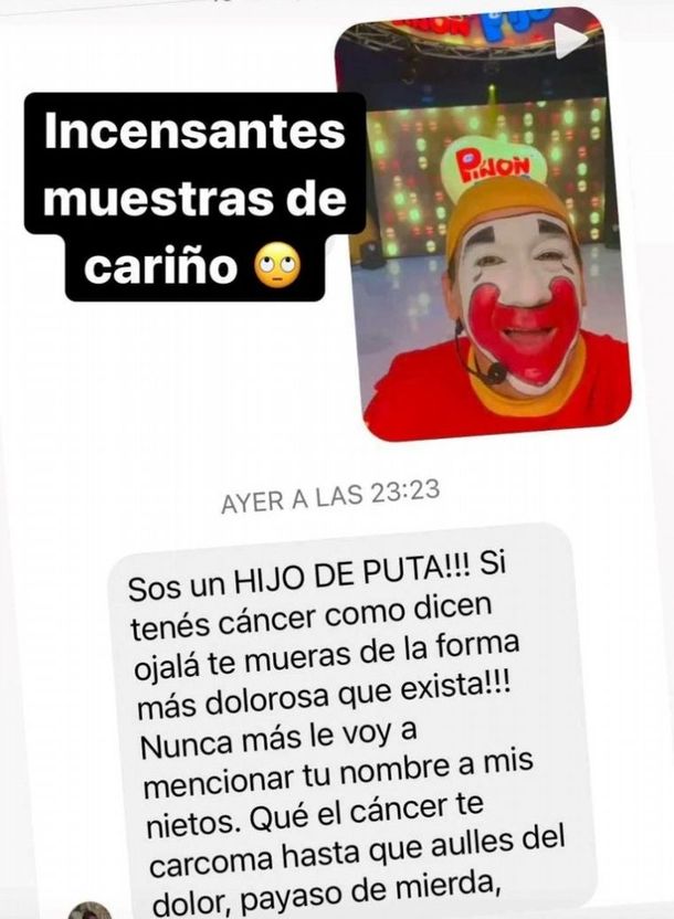 Una usuaria muy violenta le escribió un terrible mensaje: “Sos un hijo de p. Si tenés cáncer, como dicen, ojalá te mueras de la forma más dolorosa que exista. Nunca más le voy a mencionar tu nombre a mis nietos. Que el cáncer te carcoma hasta que aúlles del dolor, payaso de mierda”, escribió una mujer.
