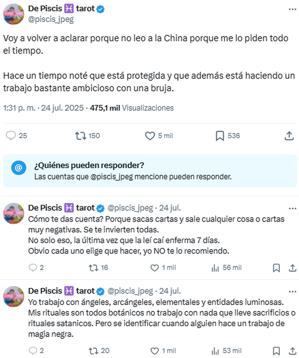 "Voy a volver a aclarar porque no leo a la China, porque me lo piden todo el tiempo. Hace un tiempo noté que está protegida y que además está haciendo un trabajo bastante ambicioso con una bruja", escribió, dejando entrever que no se trata de una sospecha aislada sino de una convicción formada a partir de intentos fallidos de lectura.