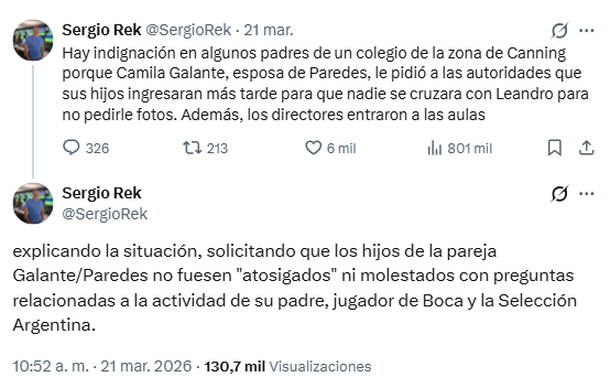 El tema tomó fuerza luego de que el periodista Sergio Rek compartiera detalles en su cuenta de X. "Hay indignación en algunos padres de un colegio de la zona de Canning porque Camila Galante, esposa de Paredes, le pidió a las autoridades que sus hijos ingresaran más tarde para que nadie se cruzara con Leandro para no pedirle fotos", escribió.