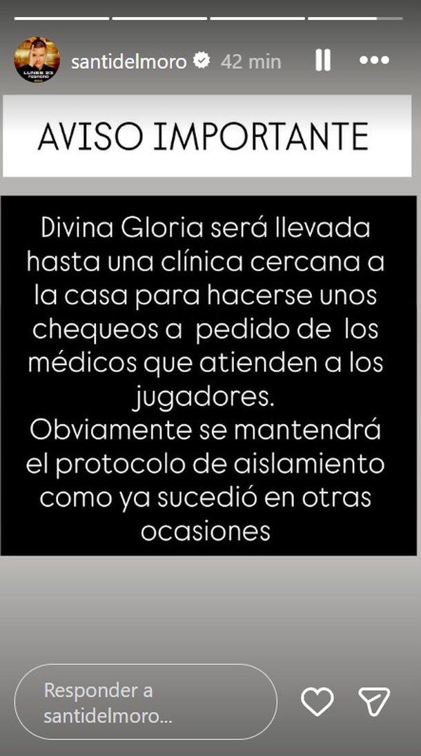 A través de sus historias de Instagram, Del Moro llevó tranquilidad a los seguidores del reality explicando que la decisión fue tomada por el equipo médico que monitorea a los participantes las 24 horas.