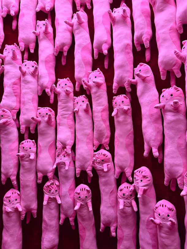 Seguimos avanzando y para el próximo escenario deben quitarse los zapatos para disfrutar de una de las sensaciones más relajantes y suaves, un espacio completamente de peluche fucsia: alfombras suaves y paredes de tela afelpada donde la gente aprovechaba a escribir con los dedos los nombres de sus gatitos ya que una de las paredes contaba con una cantidad importante de peluches de gatos recreando el escenario perfecto para una foto.