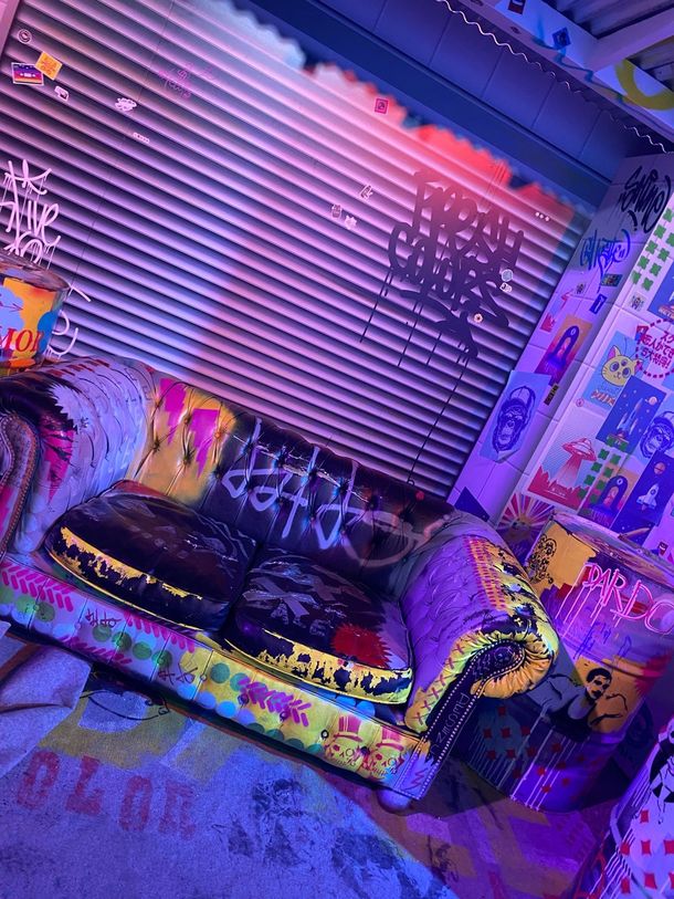 Luego nos recibe otro mundo que cambia por completo, un estilo más urbano, donde encontramos teléfonos de la época de los 80 y 90 colgados, con grafitis, y manchados con muchos colores, una bici estacionada con flores amarillas al estilo de Margarita, un sillón muy canchero con roturas que invita a hacerte tanta cantidad de fotos como se pueda, ideal si tenes niños para sentarlos y obtener la foto perfecta.