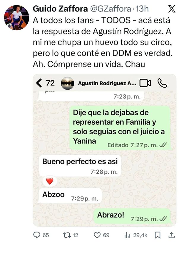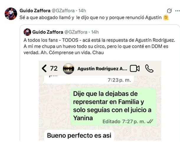 En el intercambio por WhatsApp, Záffora fue puntual al consultarle: "Dije que la dejabas de representar en familia y solo seguías con el juicio a Yanina". La contestación de Rodríguez fue breve y tajante: "Bueno, perfecto. Es así", antes de cerrar el diálogo con un "Abrazo".