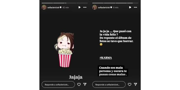 En su primer posteo, la modelo compartió un sticker con la imagen de una chica comiendo pochoclos y escribió un simple "jajaja". Sin embargo, luego fue más directa con una serie de frases que parecían alinearse perfectamente con lo sucedido: “Ja ja ja… ¿Qué pasó con la vida feliz? De repente el álbum de fotos se tuvo que borrar. Karma. Cuando sos mala persona y oscura te pasan cosas malas”, deslizó.