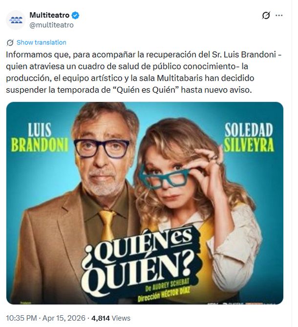 A través de un comunicado difundido en redes sociales, el complejo Multiteatro informó que, "para acompañar la recuperación del Sr. Luis Brandoni —quien atravesaba un cuadro de salud de público conocimiento—, la producción, el equipo artístico y la sala decidieron suspender la temporada de la obra hasta nuevo aviso".