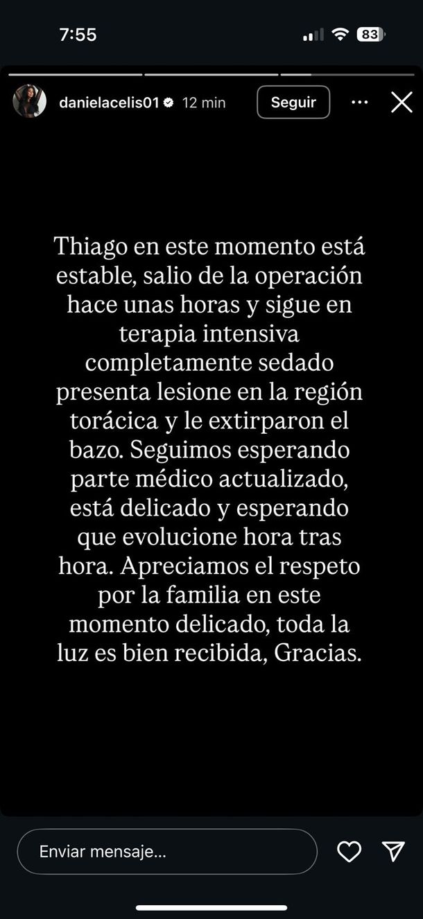 Daniela Celis, compartió una actualización del parte médico de Thiago Medina en una historia de Instagram, donde expresó que "en este momento está estable, salió de la operación hace unas horas y sigue en terapia intensiva".