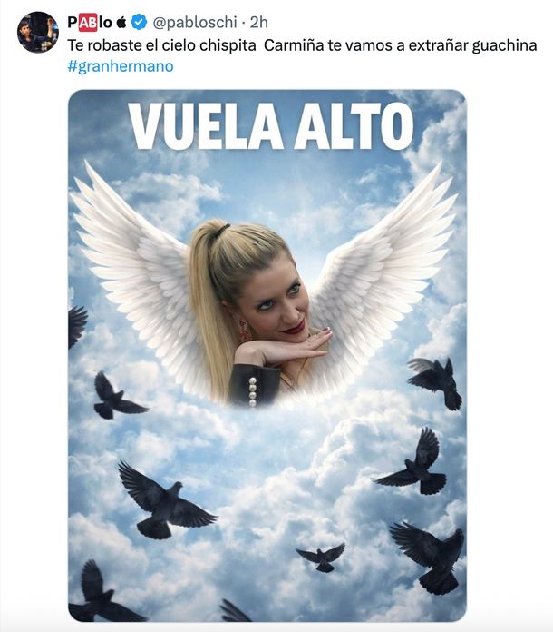 Sin embargo, más tarde el usuario puso otro tuit en el que dio a entender que Carmiña sería expulsada. "Vuela alto", dice la placa, mientras que en la publicación expresó que la iba a "extrañar".