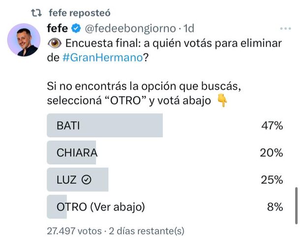 Quién se va de Gran Hermano este lunes según las encuestas de Fefe Bongiorno