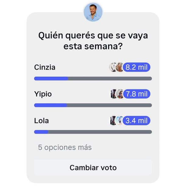Como es costumbre, el periodista y especialista en el reality, Fede Bongiorno (LAM), lanzó un masivo sondeo en Instagram para medir el termómetro del público. Los resultados arrojaron una sorpresa absoluta: a pesar de haber mantenido una imagen positiva impecable durante un mes y medio, Cinzia Francischiello aparece como la principal candidata a abandonar la casa. Con más de 8.200 votos en contra, la participante pasó de ser favorita a quedar en el centro de la zona de riesgo por decisión de la audiencia.