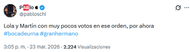 De acuerdo a un reciente tuit del "gurú", "Lola y Martin" están "con muy pocos votos, en ese orden, por ahora". De manera que la próxima eliminada sería Lola.