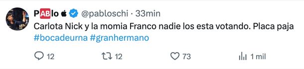 Ya más cerca de la hora del comienzo de la definición, el tuitero puso nombres completos. "Carlota, Nick y la momia Franco, nadie los está votando", completó, para anotar a los tres se encuentran en la cuerda floja, según su boca de urna.