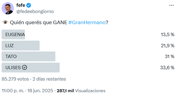 El ya conocido panelista de LAM (América) consultó a su público de redes sociales por el próximo y último resultado de Gran Hermano. Llamativamente, Ulises se ubica con la mayor cantidad de votos positivos (33,6%), en un sondeo al cual respondieron más de 85.000 personas en X.