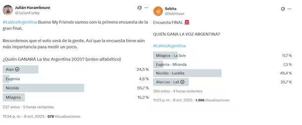 Según las votaciones que se fueron viendo, especialmente en X (ex Twitter), la definición sería entre Nicolás y Alan. Sin embargo, la gran mayoría da como ganador al integrante del Team Luck Ra con un 55%.