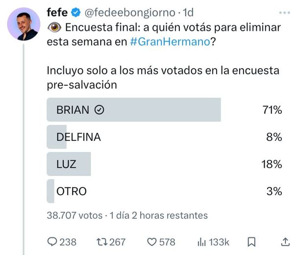 Fefe Bongiorno es uno de los más reconocidos encuestadores del reality show más famoso de la televisión. Tras consultarle a su público a quién votarían para eliminar este domingo, la respuesta fue lo suficientemente contundente como para que el domingo el resultado sea otro.