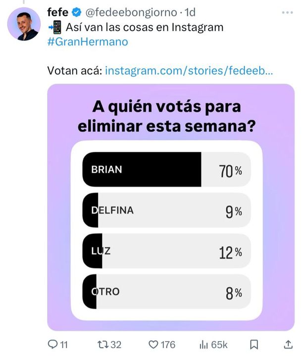 En tanto, la tendencia se repite en Instagram, donde el vendedor ambulante también obtuvo un 70% de votos negativos. La coincidencia en ambas redes sociales -que no ocurre siempre- invita a pensar que, definitivamente, Brian abandonará la casa más famosa del país este domingo.