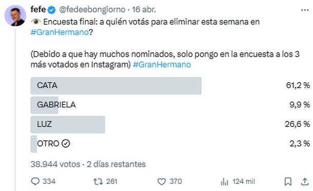 Fefe Bongiorno lanzó, una vez más, los sondeos que permiten adelantarse a la gala de eliminación de este domingo. Muchos internautas se preguntan quién podría irse y la encuesta del influencer expresa perfectamente la intención del público, al menos, en redes sociales.