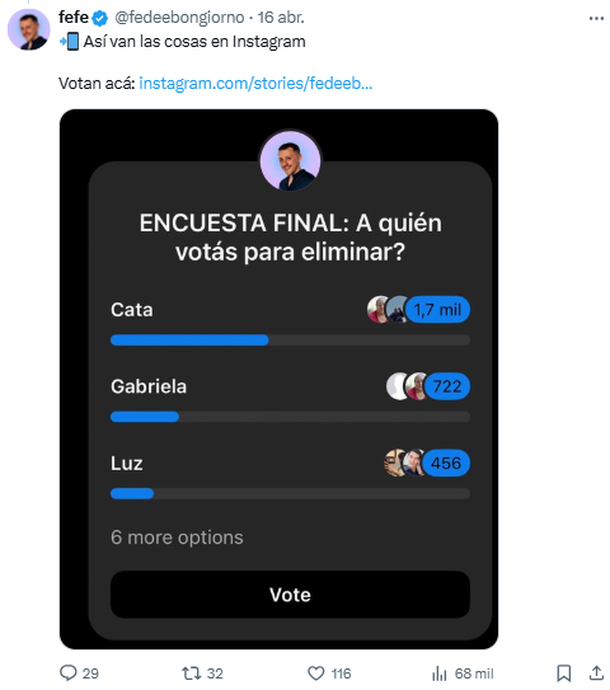 Finalmente, Instagram coincidió bastante con lo expresado en X, aunque en segundo lugar se ubica Gabriela, como posible eliminada del próximo domingo. En primer lugar está la médica pediatra, mientras que el tercer puesto quedó para la jujeña.