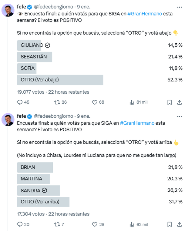 De acuerdo a la encuesta realizada por Federico Bongiorno en la red social X, "Sopa" Buscio no tendrá un buen domingo. Fue la participante que cosechó la menor cantidad de votos (11,8%) y, por ende, la que mayor riesgo corre de irse. No obstante, los votos válidos son aquellos que se envían oficialmente al 9009, por lo que esto puede ser una mera estimación. A ella, le sigue Giuliano Vaschetto, con un 14,5% de los votos.