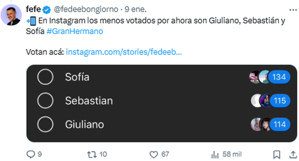 En lo que respecta a Instagram, las votaciones son similares: Giuliano se ubica con la menor cantidad de votos (114), le sigue Sebastián "Bambi" Bello (115) y luego Sofía Buscio, con 134 votos.