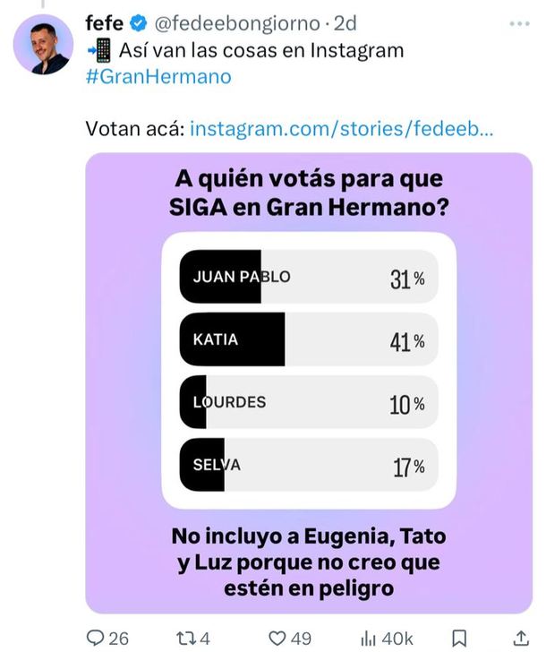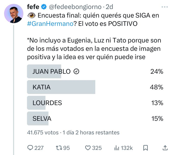 Fede Bongiorno, reconocido tuitero y panelista de Streams Telefe, volvió a lanzar los sondeos que permiten anticiparse al resultado del lunes, aunque la realidad es que lo único que vale es el voto del público a los canales oficiales de Telefe.
