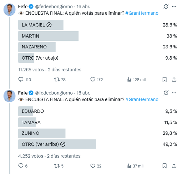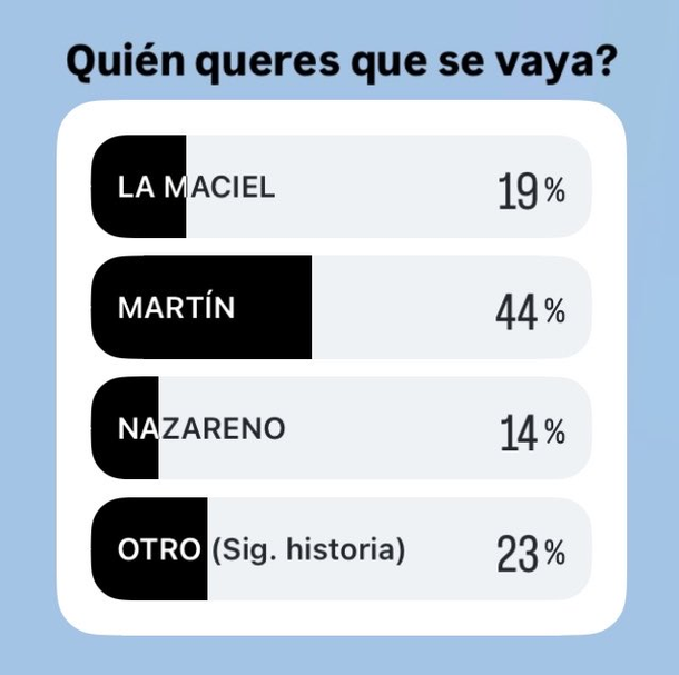 De acuerdo con un relevamiento realizado en Instagram por Fefe Bongiorno en X, los nombres que encabezan la posible salida son Martín Rodríguez, quien reúne el 38% de los votos negativos, seguido por La Maciel, con un 28.6%.