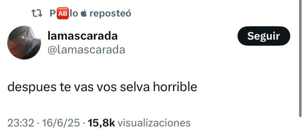 Luego, compartió un mensaje de una usuaria de X que escribió: "Después te vas vas, Selva horrible", ratificando su postura sobre quién abandonará el juego este miércoles.
