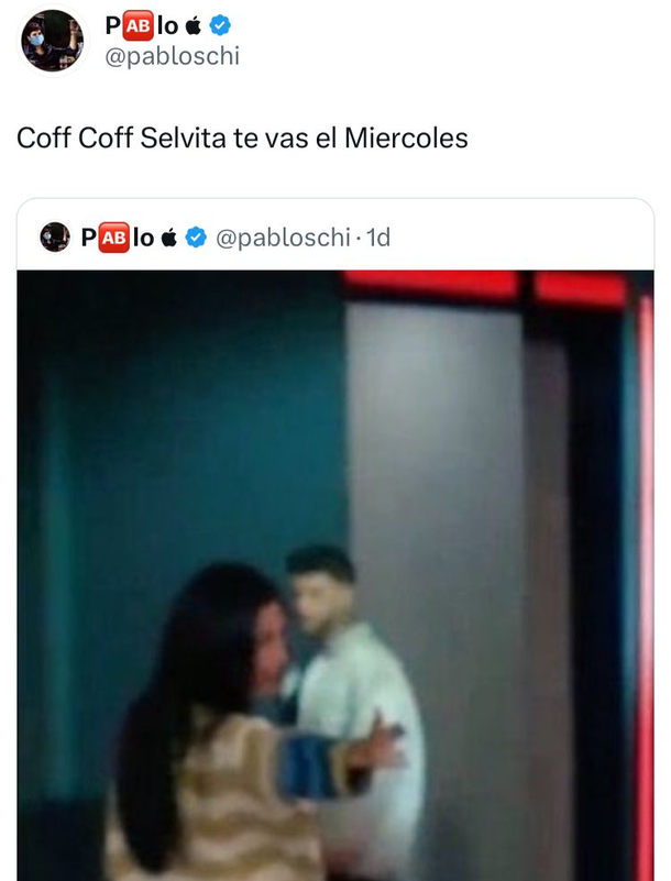 En este sentido, el reconocido tuitero y referente del ciclo de Telefe, Pabloschi, ya reveló quién podría dejar la casa hoy mismo. Si bien en las últimas horas no se ha pronunciado al respecto, posterior a la salida de Juan Pablo escribió: "Coff, coff, Selvita, te vas el miércoles", dando a entender que esta noche será el turno de la uruguaya.