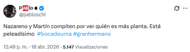 En esta oportunidad, escribió: "Nazareno y Martín compiten por ver quién es más planta. Está peleadísimo", marcando una determinante tendencia.