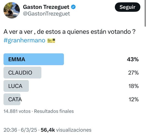 Por esa razón, el exparticipante de la primera edición del reality en Argentina y analista colocó en las encuestas a los cuatro que habían obtenido mayor cantidad de votos en los sondeos anteriores: Emma Vich, Claudio "Papucho" Di Lorenzo, Luca Figurelli y Catalina Gorostidi.
