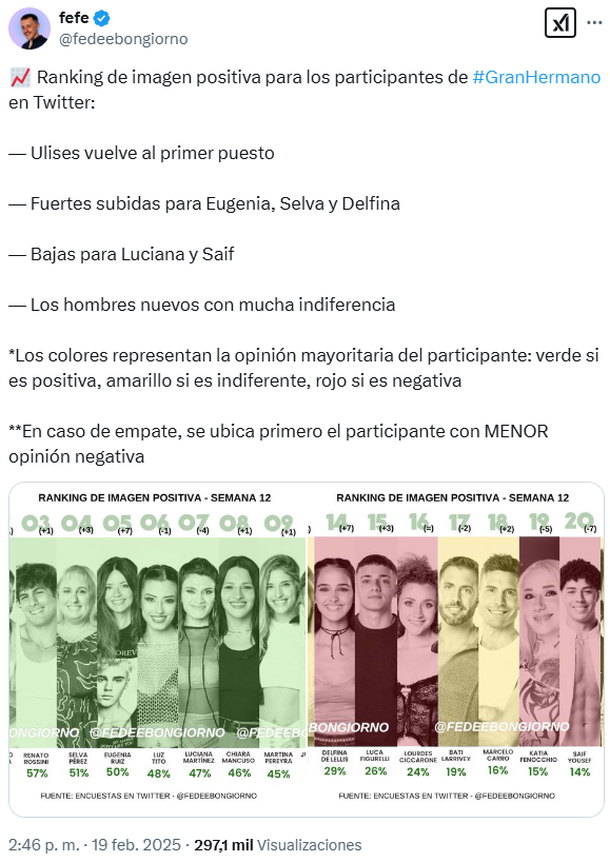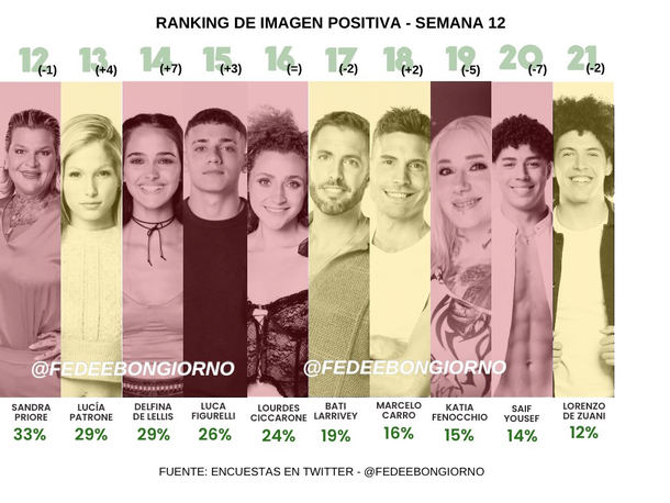 Como reconocido influencer del ciclo, Fefe Bongiorno publica a menudo las encuestas que permiten una orientación de cara a las galas de eliminación. Lo cierto es que, en esta oportunidad, la placa es positiva, por lo que el panelista ha mostrado cómo le fue a cada participante en el ránking de imagen positiva, lo que permite anticiparse a lo que sucederá el próximo domingo.