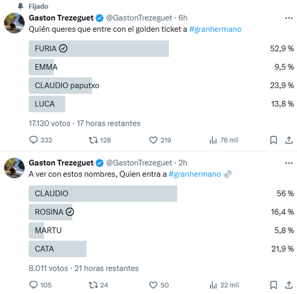 Gastón Trezeguet no quiso esperar ni un segundo: inmediatamente después de que finalizó la gala de eliminación de este lunes, lanzó las encuestas para tener a mano las primeras tendencias en torno a quién podría reingresar el próximo lunes.
